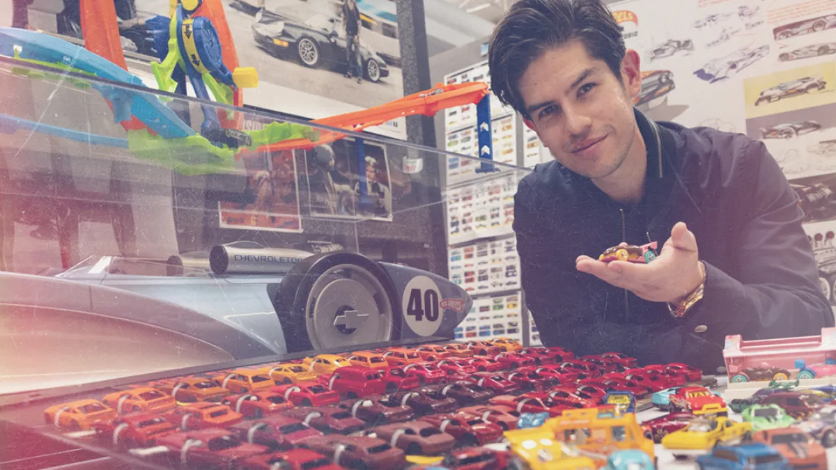 Charlie Angulo, a Hot Wheels designer, stands in front of a wall of around 800 Hot Wheels and Matchbox cars. Matchbox car was acquired by Mattel in 1997, when it purchased Tyco Toys, the former parent company of Matchbox cars.
